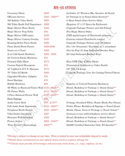 DJ🎵, Officiant🙋♂️, Coordination🙋♀️, Photo-Booths (Open-Air📸 & Magic Mirror🪄🪞), 360 3D Infinity Video Booth🎥🎬📽🎞, Sparkulars🎇⚡️, Dance on Clouds💃☁️, Bubble🫧, Snow❄️, Fog 😶🌫️, Slide shows (projected/digital), Monograms (projected/digital) plus full stage lighting! 3 DJ Booths to select from depending upon wedding package selected… (no DJ scrims here).